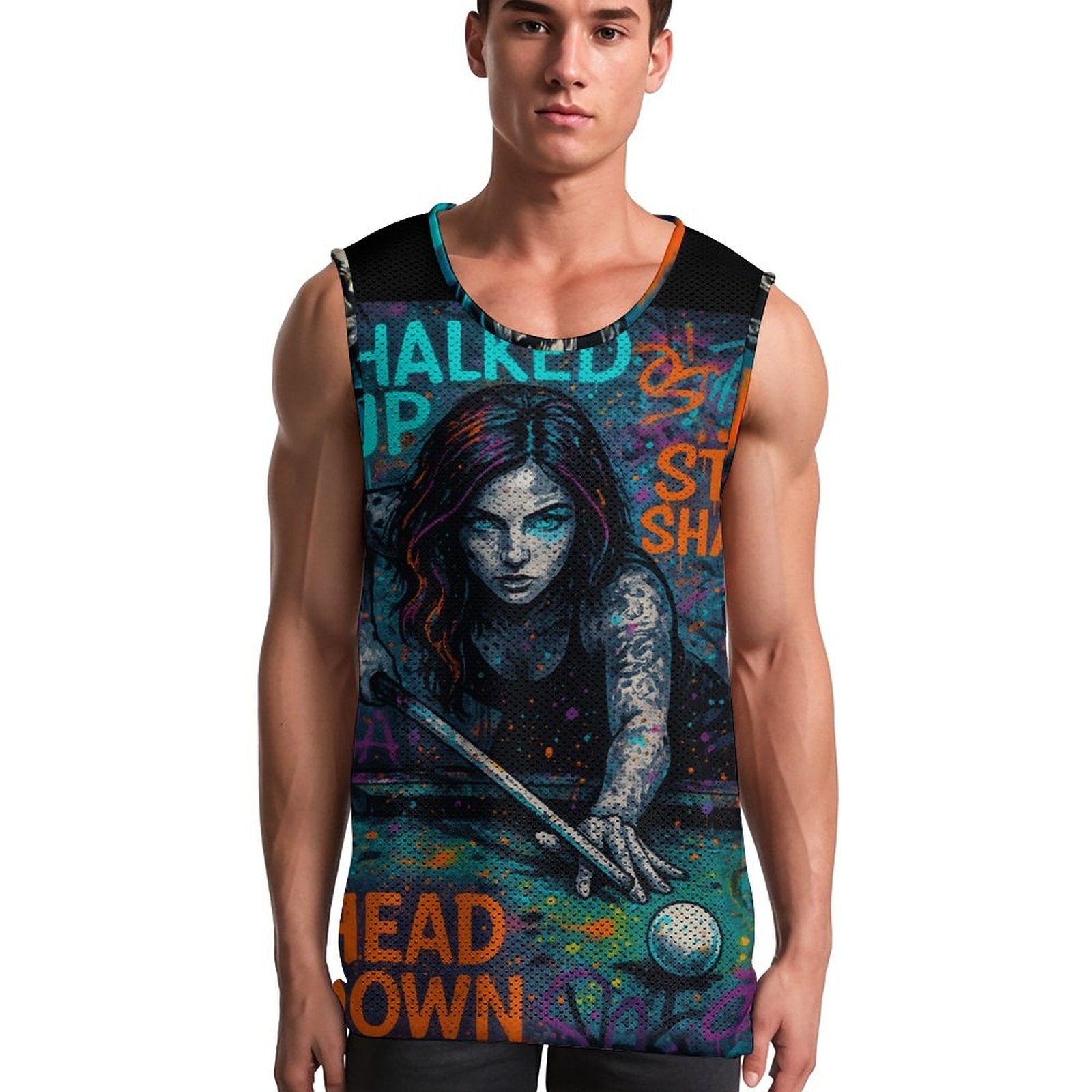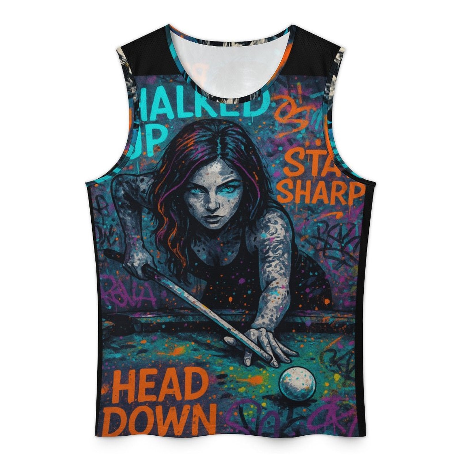 Built for heat, hustle, and stroke precision. The Chalked Up Quick-Dry Tank is a breathable mesh performance top designed for players who grind at the table and move with confidence everywhere else. Featuring the signature pool-shooter graphic with Chalked Up, Stay Sharp, and Head Down cues splashed across a vibrant backdrop, it’s bold, intense, and unapologetically competitive.
