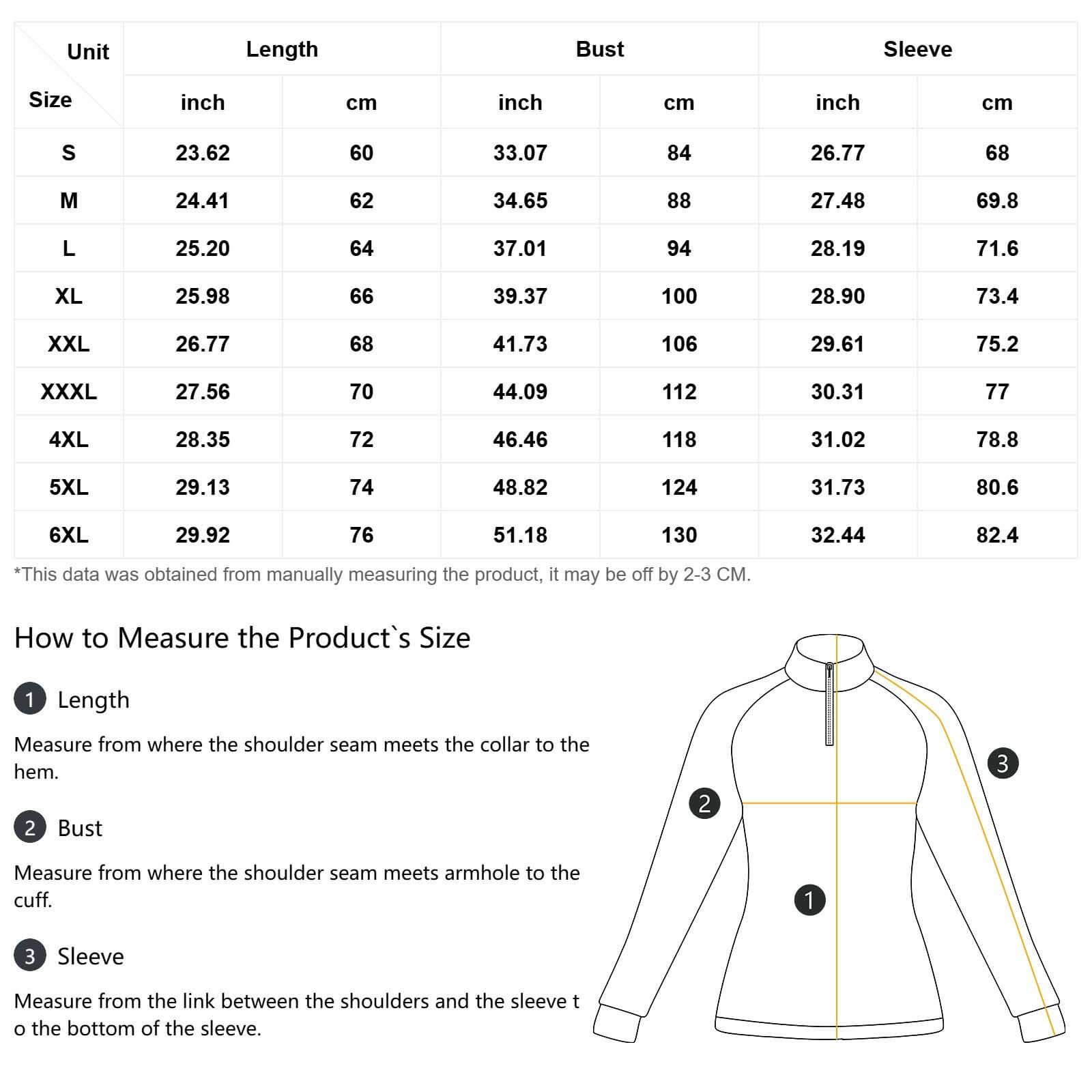 | Size | Length (cm/in) | Chest (cm/in) | Sleeve Length (cm/in) |