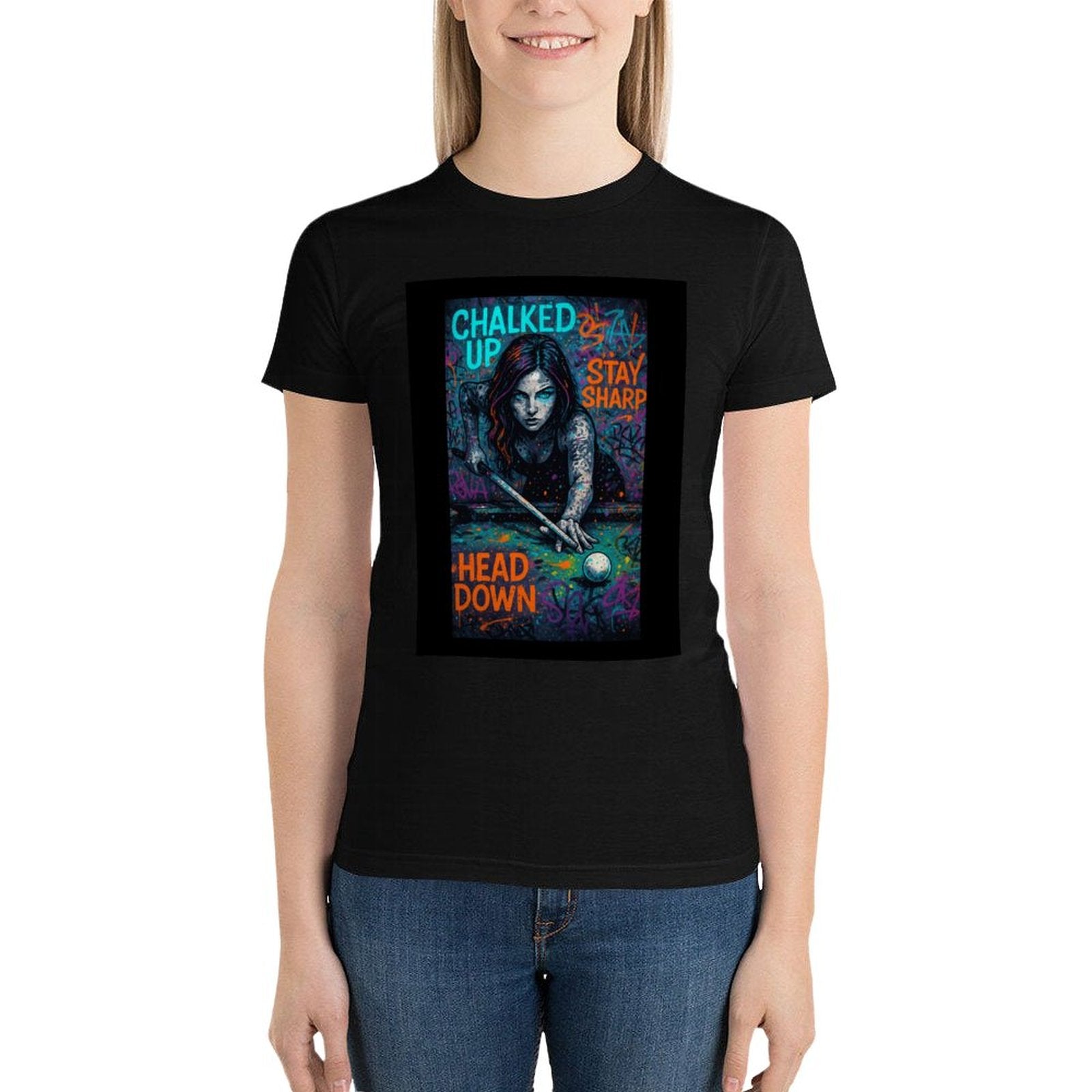 The Chalked Up Front-Print Tee delivers the signature pool-shooter artwork in a clean single-sided layout—perfect for women who want statement art without the full wrap. Featuring the fierce cue-focused illustration with Chalked Up, Stay Sharp, and Head Down text, it’s confident, modern, and made to stand out at the table or on the street.Printed using high-definition DTF technology for rich color and crisp detail, this shirt maintains sharp graphics wash after wash. The breathable cotton build offers softness, comfort, and durability for everyday wear. Style it with denim, shorts, leggings, or throw a flannel or jacket over it — the shirt holds its attitude no matter how you wear it.