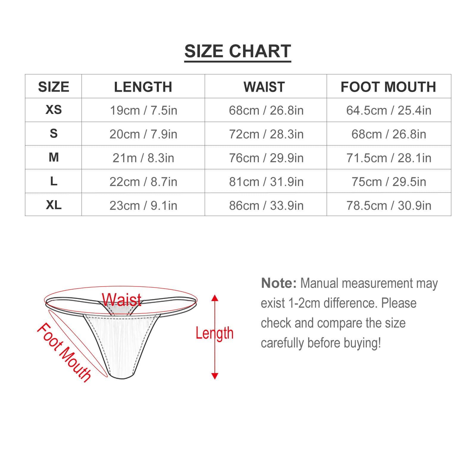 | Size | Length of Bottom (cm/in) | Waistline (cm/in) | Leg Opening (cm/in) |
