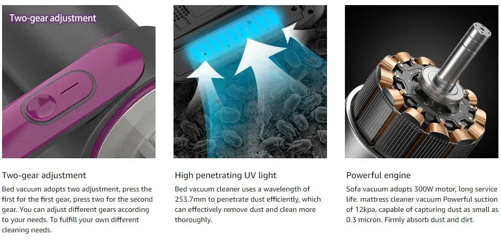 - Powerful Suction: Equipped with 12Kpa suction power and a large induction area, this vacuum effectively captures hidden dust mites with its U-shape UV lamp.