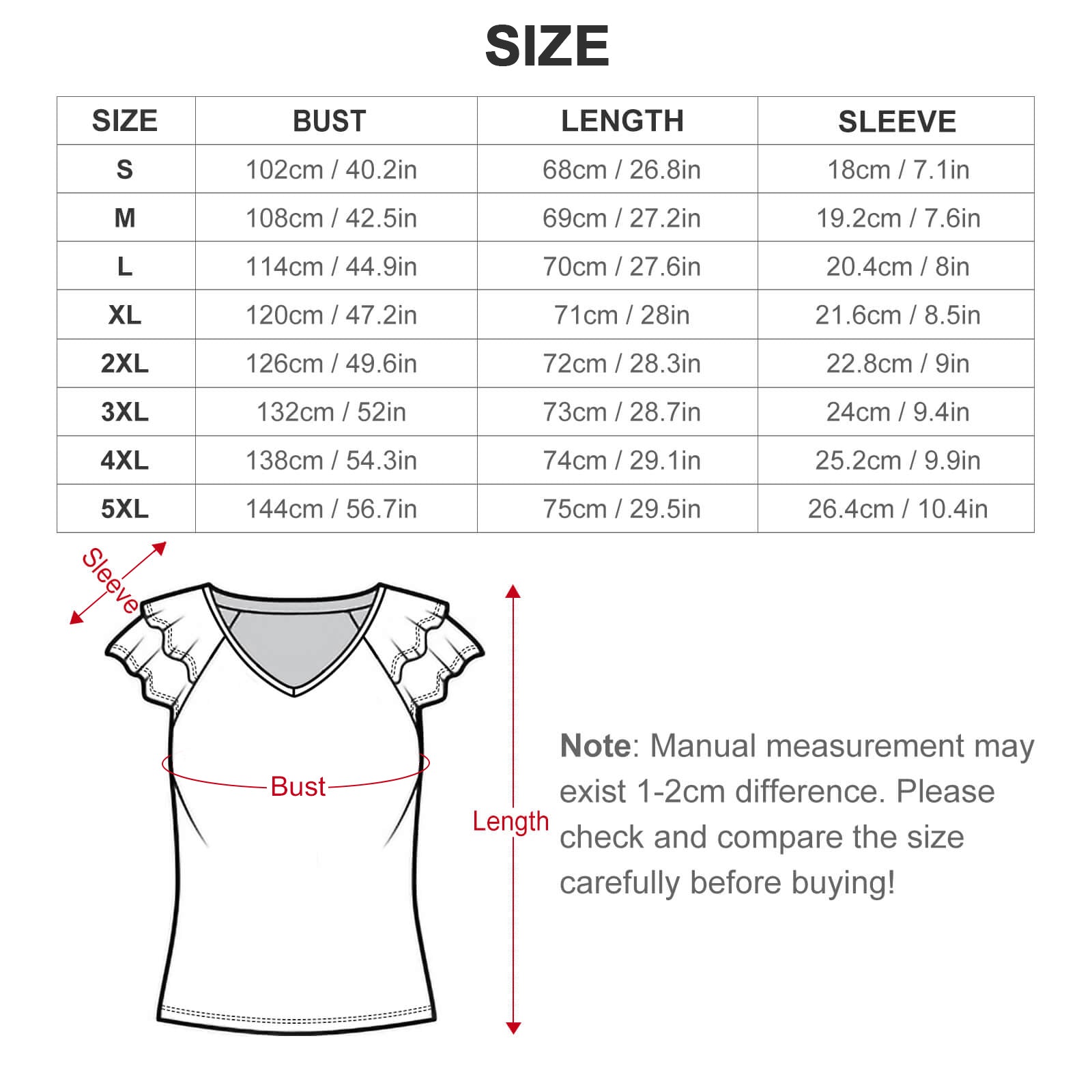 - Product Performance: The casual loose-fitting Ruffle V-Neck T-Shirt features with v neck, ruffle short sleeves to shape the perfect outline of your arms and add elegance for you. The Ruffle V-Neck T-Shirt is made of soft and comfortable fabric, lightweight and very comfortable to your skin. The Ruffle V-Neck T-Shirt goes well with shorts, jeans, leggings and skirts. Fashion to pair with sunglasses, necklace or belt. Printed with distinctive patterns, the Ruffle V-Neck T-Shirt makes you elegant, stylish, charming and confident. Sophisticated All-over printing and multi-image splicing techniques meet your various customization demands.